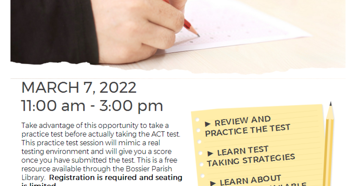 Take advantage of this opportunity to take a practice test before actually taking the ACT test. This practice test session will mimic a real testing environment and will give you a score once you have submitted the test. This is a free resource available through the Bossier Parish Library. Registration is required and seating is limited.