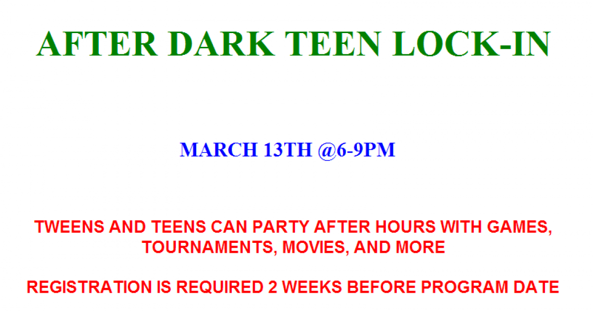 Tweens and teens can party after hours with games,tournaments, movies, and more. Registration is required 2 weeks before program date.