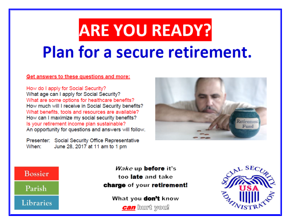 A representative from the Social Security Office will be present to discuss retirement solutions.