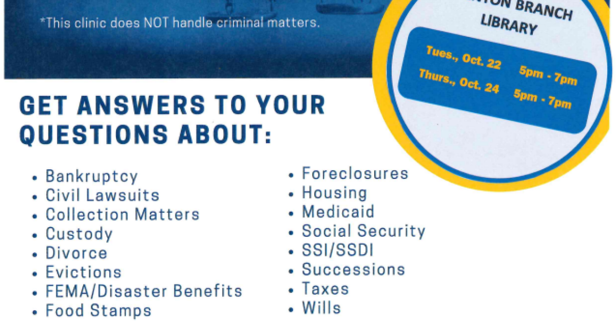 It's Lawyers in Libraries Week 2024! If you or someone you know could use legal advice (for non-criminal matters), stop by Benton Branch for a FREE one-on-one consultation with a lawyer. Also, a number of helpful resources are available.