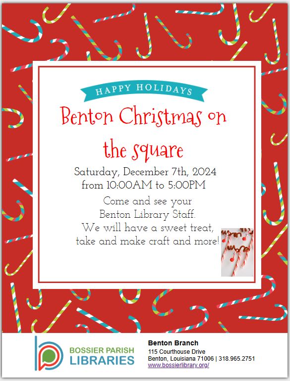 BPL's Benton Branch Library will be closed on Saturday, December 7, 2024. Join us for Benton's 24th Annual Christmas on the Square Festival and Parade! We'll see you there!