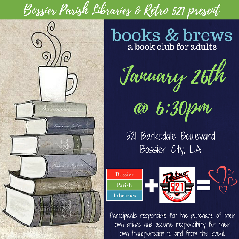 Bossier Parish Libraries & Retro 521 pesent, Books & Brews: a Book Club for Adults. Happening the fourth Friday of every month at 6:30pm. This month we will be meeting at Retro 521 located at 521 Barksdale Boulevard, Bossier City.