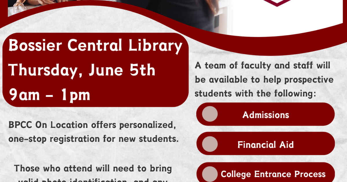 BPCC On Location offers personalized, one-stop registration for new students. Those who attend will need to bring valid photo identification, and any available test scores (ACT, SAT, Accuplacer), as well as previous college transcripts.