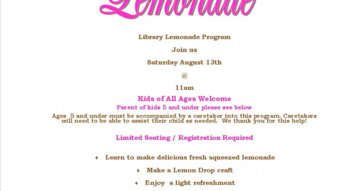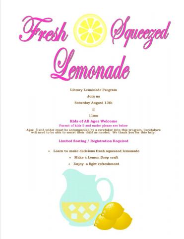 Celebrate Lemonade Day with us! We'll be learning to make fresh squeezed lemonade and will be doing fun crafts and enjoying refreshments. Kids of all ages welcome. Kids ages 5 and under must be accompanied by a caretaker. Caretakers will need to be able to assist their child as needed. We thank you for this help. Seating is limited so registration is required.