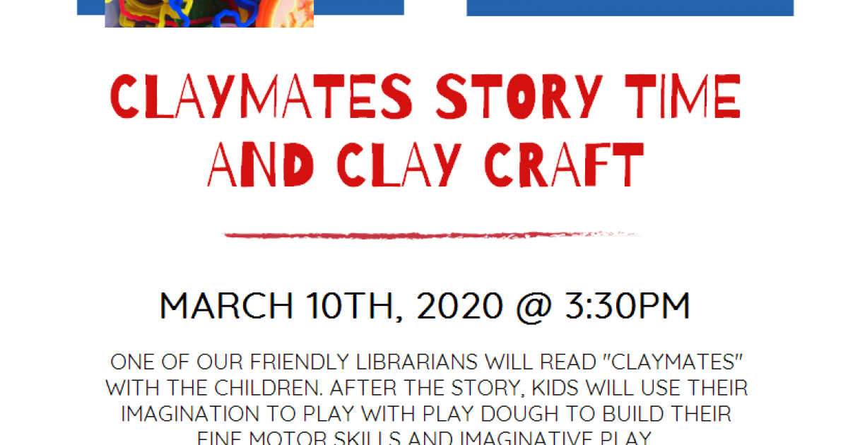 One of our friendly librarians will read "Claymates" with the children. After the story, kids will use their imagination to play with play dough to build their fine motor skills and imaginative play. Registration is required 2 weeks before program date.