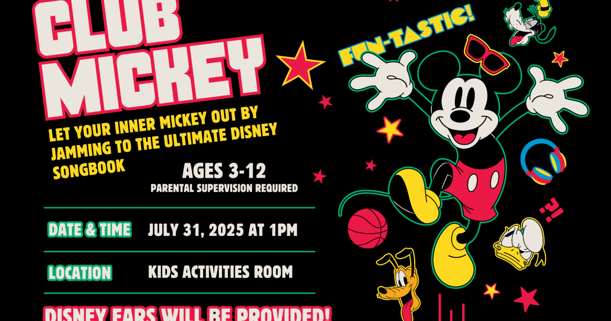Let your inner Mickey Mouse out while jamming to the ultimate Disney songbook! Snack provided while supplies last. Parental supervision required.