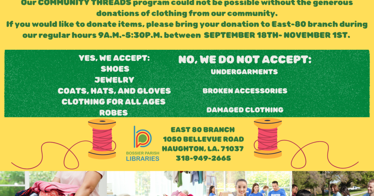 During September 18th through November 1st, we are accepting donations for the Community Threads: Clothing Swap event on November 19th.