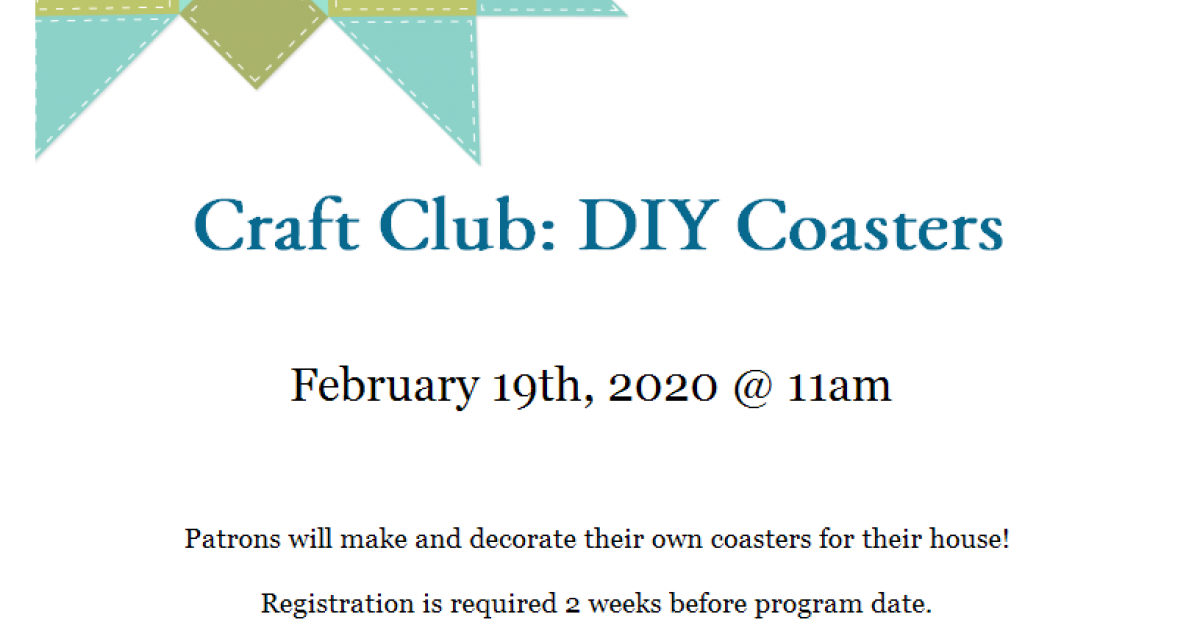 Patrons will make and decorated their own coasters for their home! Registration is require 2 weeks before program date. Library staff will call and confirm the day before program. Failure to confirm will result in cancellation.