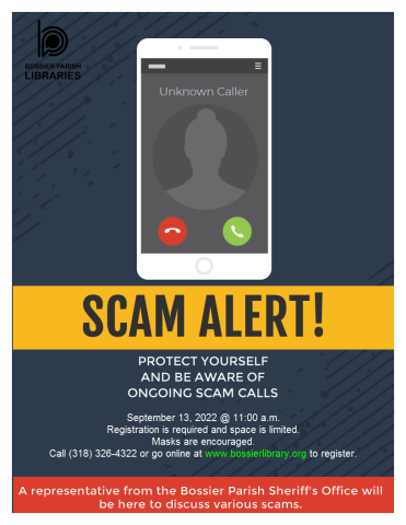 Do you want to learn how to avoid scams? If so, join us for this informational session on various scams, especially those that target our senior citizens. A representative from the Bossier Parish Sheriff's Office will be here to share some valuable information. Registration is required for this event and space is limited. Call (318) 326-4233 or go online at www.bossierlibrary.org under calendar of events to register for this event. Masks are encouraged.
