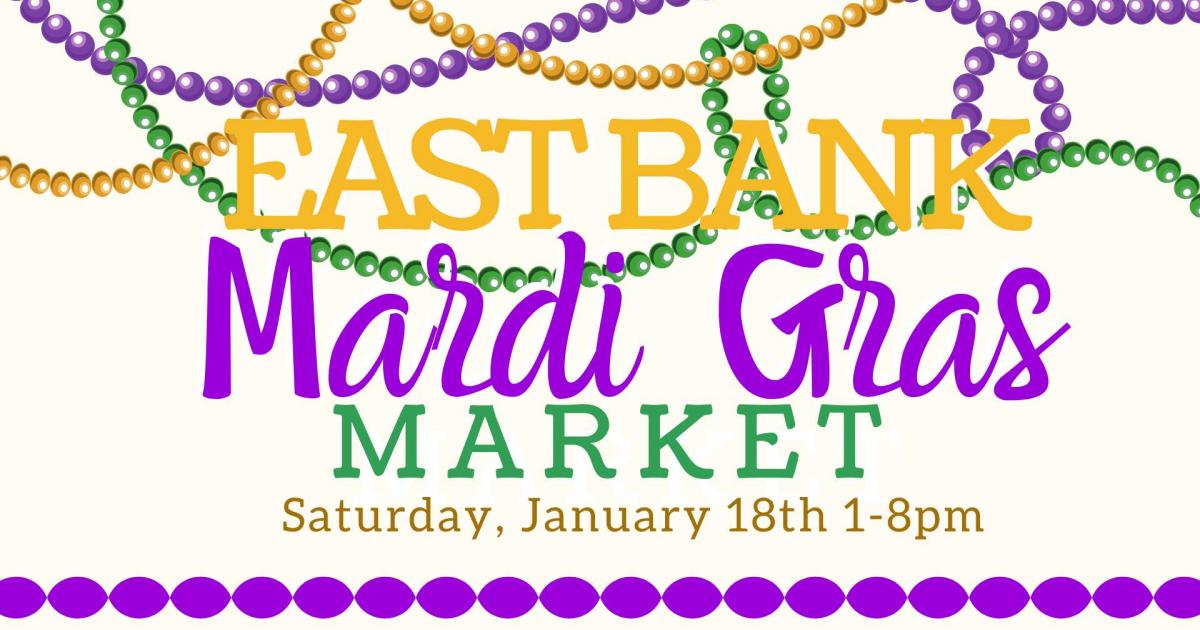 Join us in the East Bank! The East Bank Mardi Gras Market offers a whole day of activities to kick off the Mardi Gras Season! Local vendors will be selling local handmade items, art, and produce. Local musicians will be playing your favorite tunes. East Bank restaurants and area food trucks will keep your bellies full. There will be a Cajun style Mardi Gras Golf Cart Parade at 6pm.