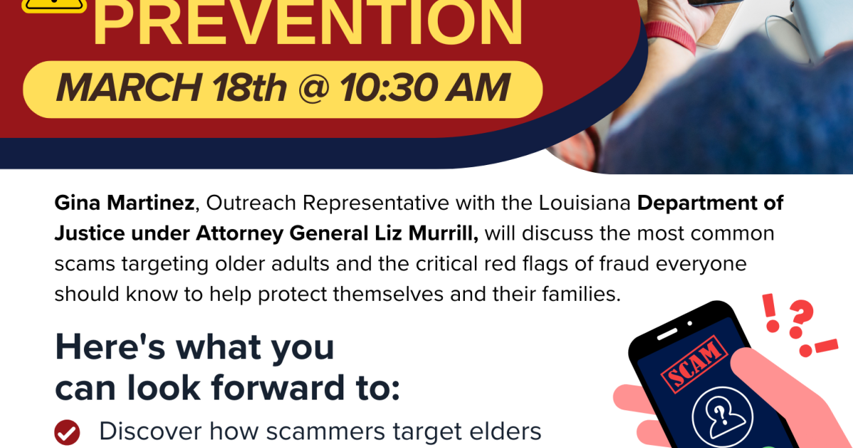 Gina Martinez, Outreach Representative with the Louisiana Department of Justice under Attorney General Liz Murrill, will discuss the most common scams targeting older adults and the critical red flags of fraud everyone should know to help protect themselves and their families.