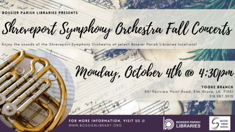 You're invited to a fall concert at 4:30 PM today at the Tooke Branch of Bossier Parish Libraries. The performance is free and open to the public, and features a Brass Ensemble from the Shreveport Symphony Orchestra.