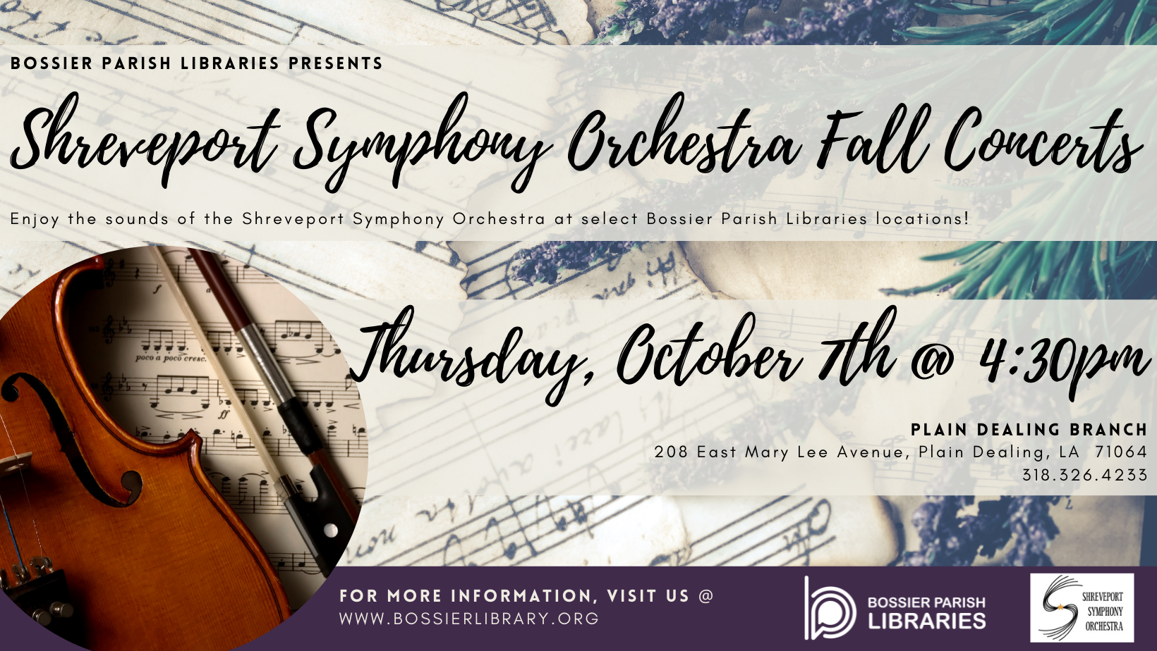 You're invited to a fall concert at 4:30 PM today at the Plain Dealing Branch of Bossier Parish Libraries. The performance is free and open to the public, and features a String Ensemble from the Shreveport Symphony Orchestra.