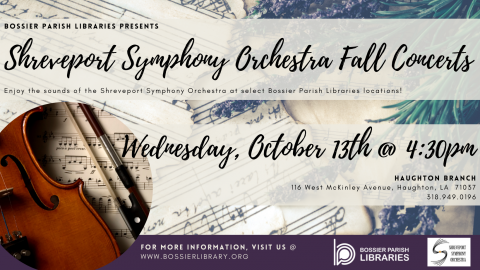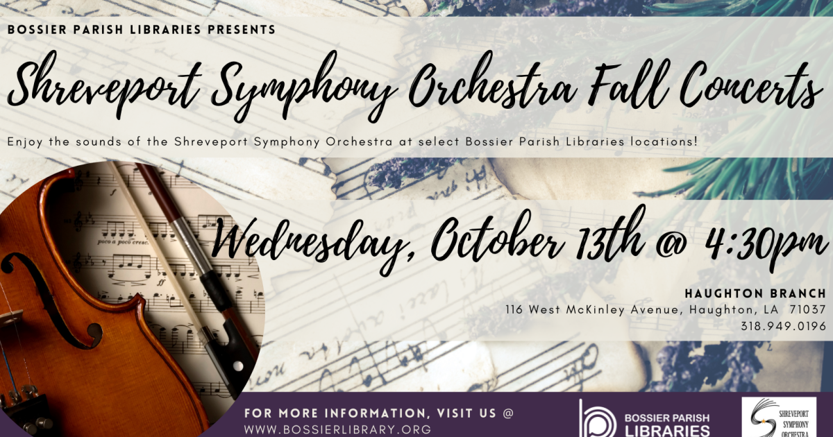 You're invited to a fall concert at 4:30 PM today at the Haughton Branch of Bossier Parish Libraries. The performance is free and open to the public, and features a String Ensemble from the Shreveport Symphony Orchestra.