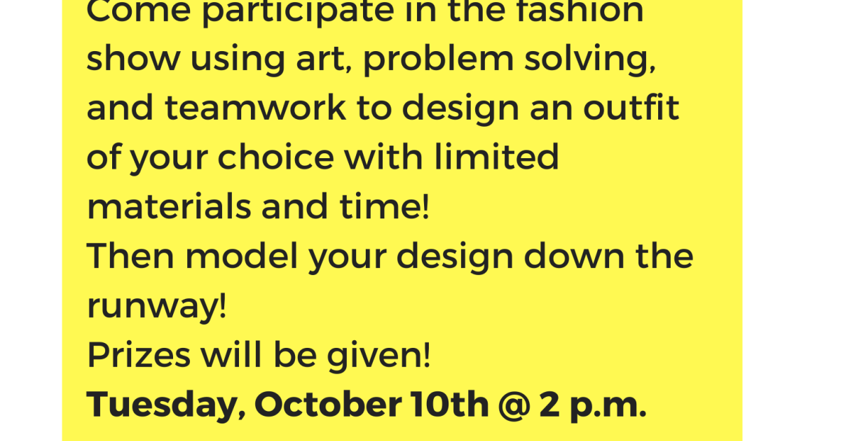 All ages come to participate in the Fall Fashion Show and Runway using art, problem solving, and teamwork while designing an outfit of your choice with limited materials and time. After creating your outfit, you will have the chance to model your design down the runway! Prizes will be provided.