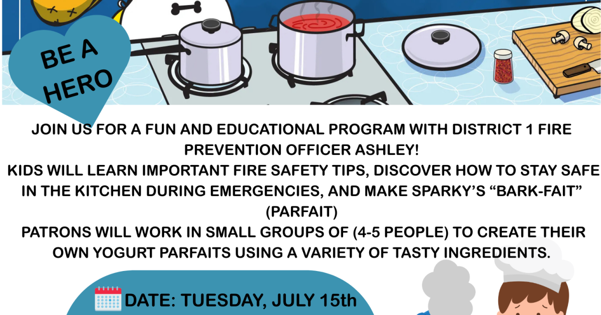 Kids will learn important fire safety tips, discover how to stay safe in the kitchen during emergencies, and make Sparky's "Bark-fait" (Parfait).