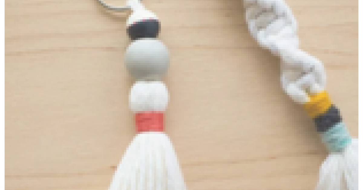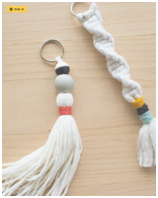 Make a macrame keychain using beads, macrame cord, and other items.