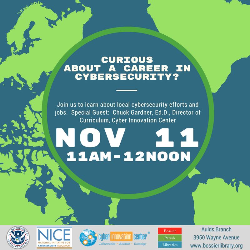 In partnership with the Department of Homeland Security and the National Initiative for Cybersecurity Education, Dr. Chuck Gardner, the director of curriculum for the Cyber Innovation Center (CIC), in Bossier City, will be hosting a talk regarding cybersecurity careers on a national and local scale, and what we’re doing in Bossier classrooms to support the education of students towards those opportunities. Learn how students are being taught to embrace 21st Century Skills and to consider all of the opportunities that await them after they finish school. In addition to working with K-12 education, the CIC is partnering with Bossier Parish Community College, Louisiana Tech University, and CSRA to help adults who may be thinking about transitioning into a career in cyber. Learn about some of the exciting opportunities that are available right here, to residents of Bossier and Caddo.
