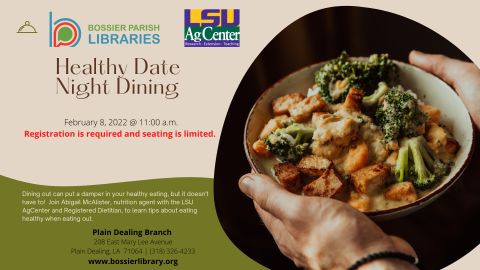 Dining out can put a damper in your healthy eating, but it doesn't have to! Join Abigail McAlister, nutrition agent with the LSU AgCenter and Registered Dietitian, to learn tips about eating healthy when eating out. Registration is required and seating is limited. You may call the library at (318) 326-4233 or go online to the library's website to register for this event.