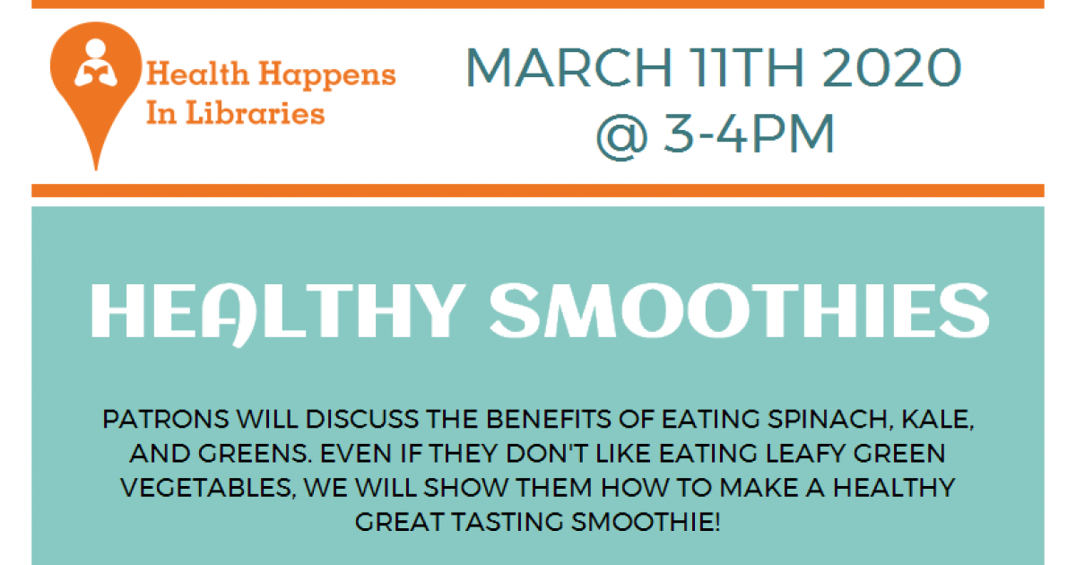 Patrons will discuss the benefits of eating spinach, kale, and greens. Even if you do not like eating leafy green vegetables, we will show you how to make a healthy great tasting smoothie! Registration is required 2 weeks before program date.
