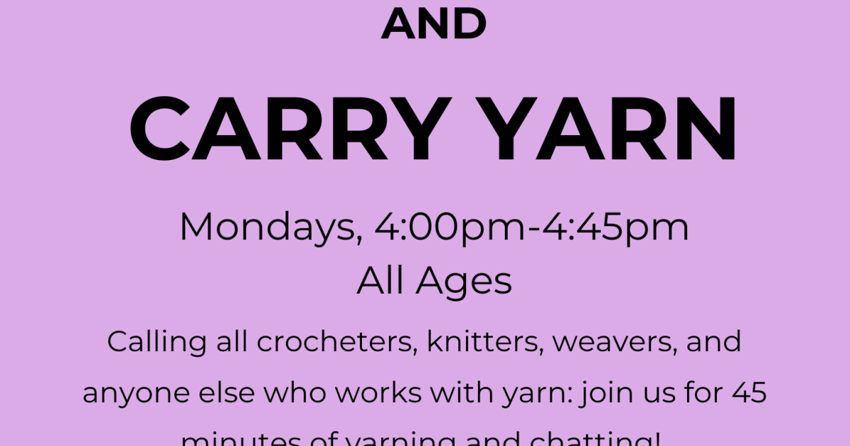 Calling all crocheters, knitters, weavers, and anyone else who works with yarn. Join us for 45 minutes of yarning and chatting! Bring your supplies and work on an existing project or start a new one.