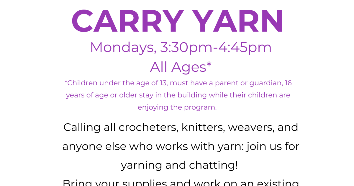 Calling all crocheters, knitters, weavers, and anyone else who works with yarn. Join us for yarning and chatting!