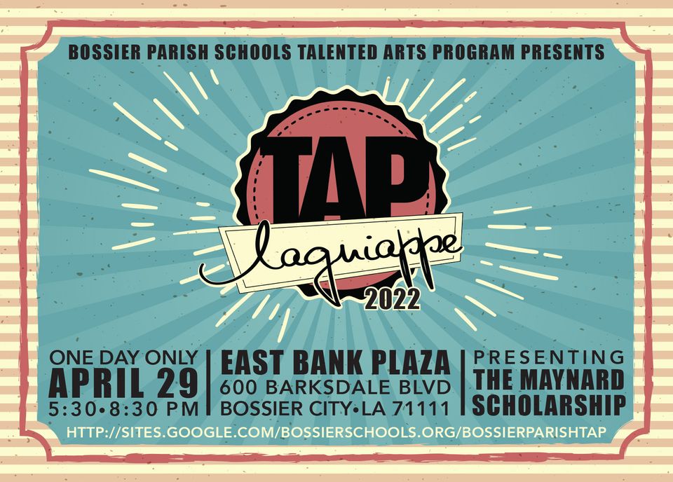 We are thrilled to partner with Bossier Schools, Bossier Arts Council, and the East Bank District to participate in TAP Lagniappe! TAP Lagniappe will feature live music and theatre performances down at the East Bank Plaza. Stop in the Bossier Arts Council building for our library book sale! All books will be sold on a donation basis and all money collected will be donated to the Bossier School libraries!