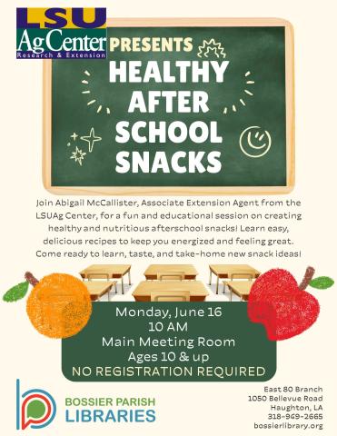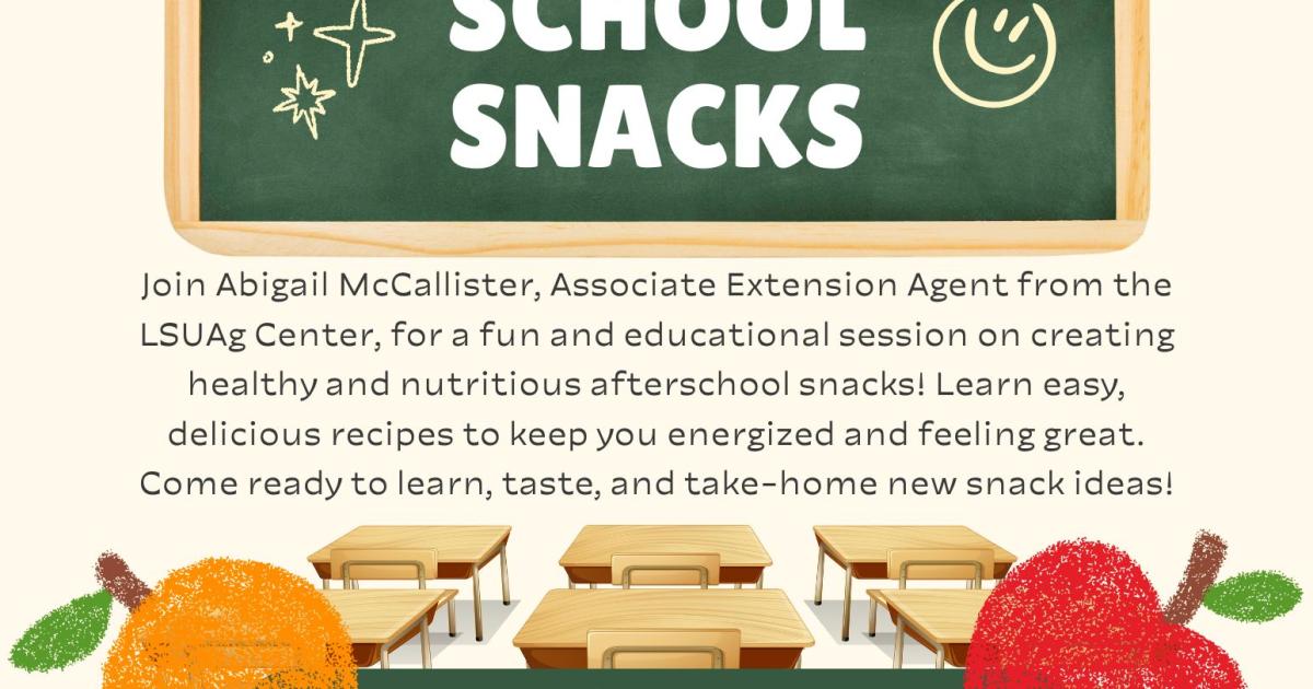 Join Abigail McCallister, Associate Extension Agent from the LSUAg Center, for a fun and educational session on creating healthy and nutritious afterschool snacks! Learn easy, delicious recipes to keep you energized and feeling great. Come ready to learn, taste, and take-home new snack ideas!