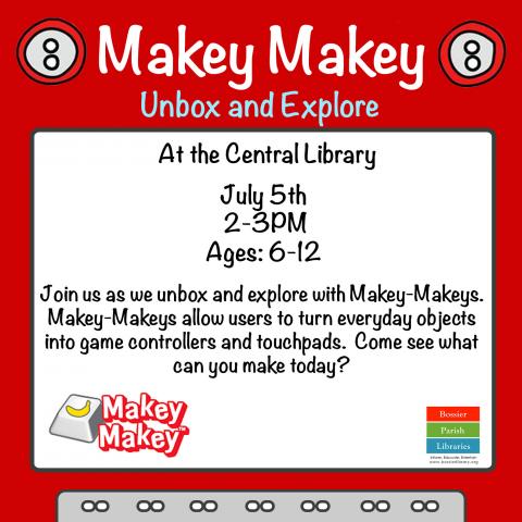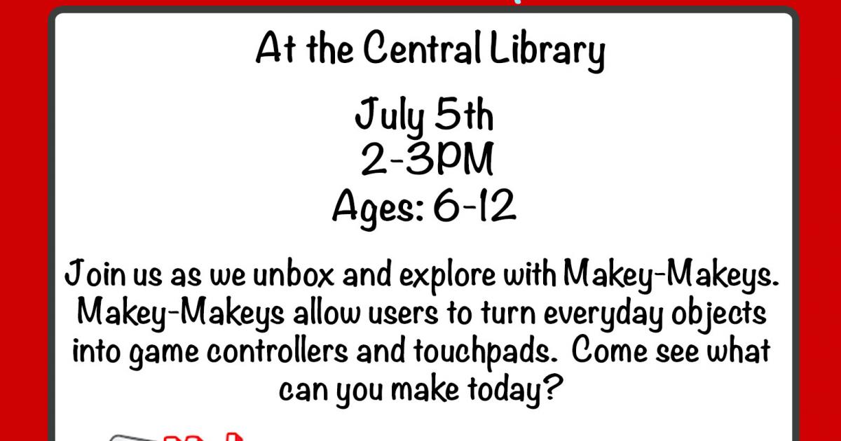 Join us in the Children's Department as we unbox and explore with Makey-Makey's. Makey-Makeys allow users to turn everyday objects into game controllers and touchpads. What can you make today?