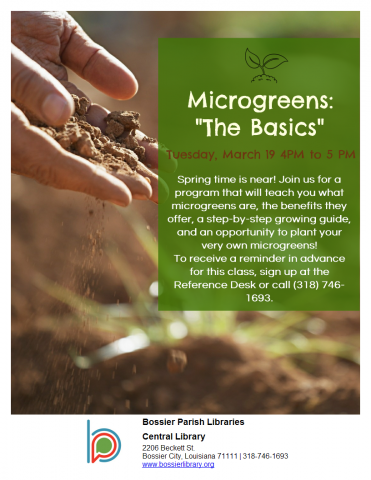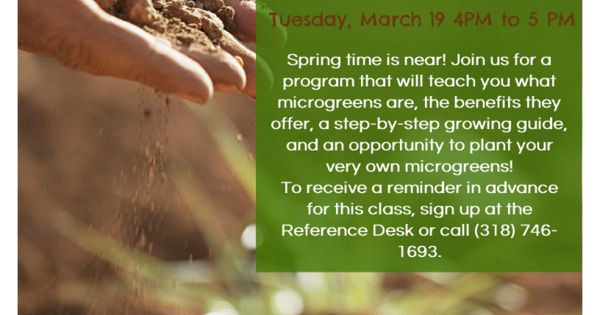 Spring time is near! Join us for a program that will teach you what microgreens are, the benefits they offer, a step-by-step growing guide, and an opportunity to plant your very own microgreens!