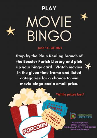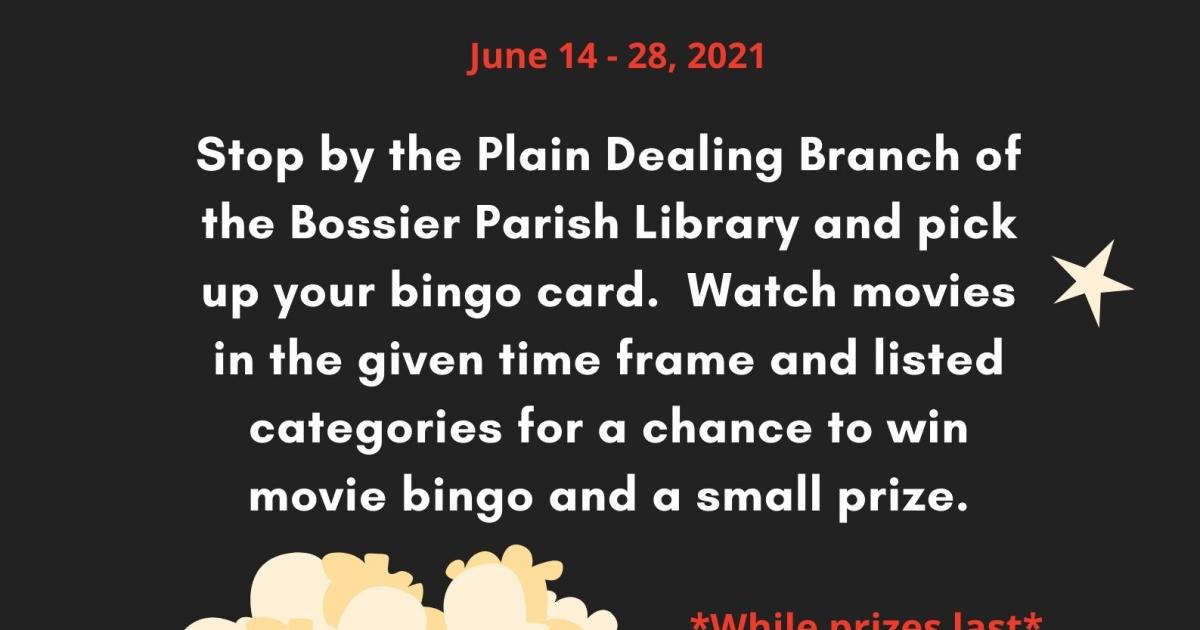 Want to play movie bingo? Stop by the Plain Dealing Branch of the Bossier Parish Library and pick up your bingo card. Watch movies in the listed categories and given time frame for a chance to win movie bingo and a small prize. So check out those movies and begin watching. Prizes are available while supplies last.