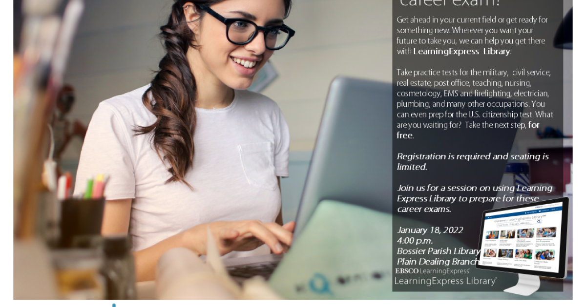 Whether you are preparing for the civil service exam, military exam, nursing exam, firefighting exam, police exam, plumbing exam, electrician exam, or other career exams, stop by the library and let us show you how to use Learning Express Library to help you practice for your upcoming career exam. You will need a library card to access this database from home.