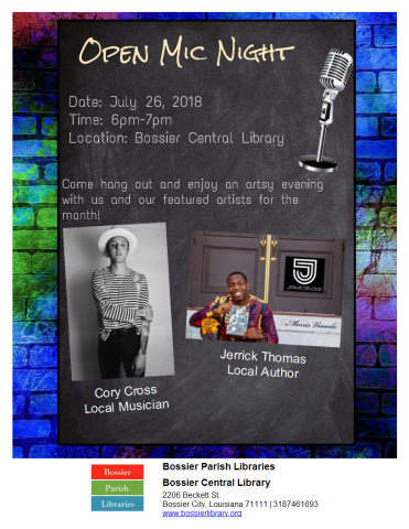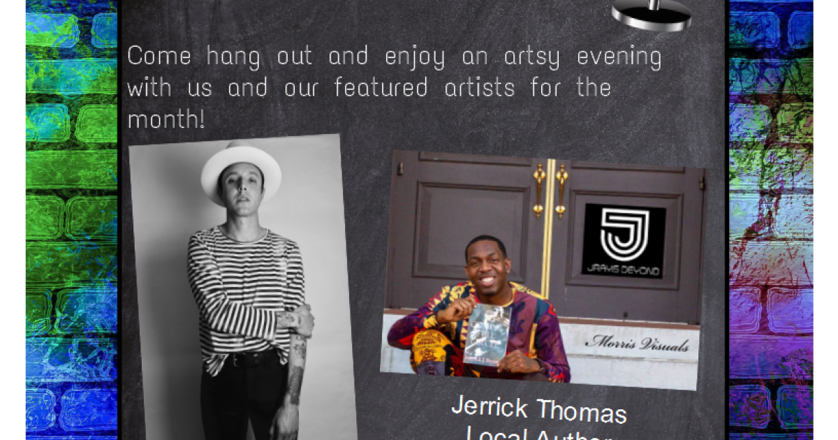 Come hang out and enjoy an artsy evening with us and our featured artists for the month, local musician Cory Cross and local author Jerrick Thomas! Seating is limited. Light refreshments will be served. Call Central Branch for more information!