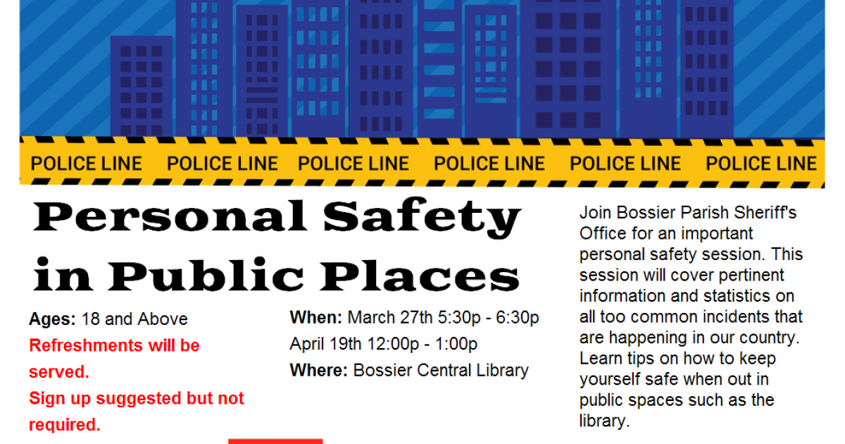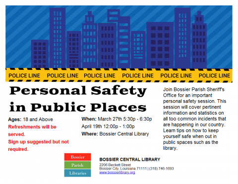 Please join the Bossier Parish Sheriff's Office and the Bossier Parish Library for an important personal safety session. This session will cover pertinent information and statistics on all too common incidents that are happening in our country. Learn tips on how to keep yourself safe when out in public spaces such as the library.