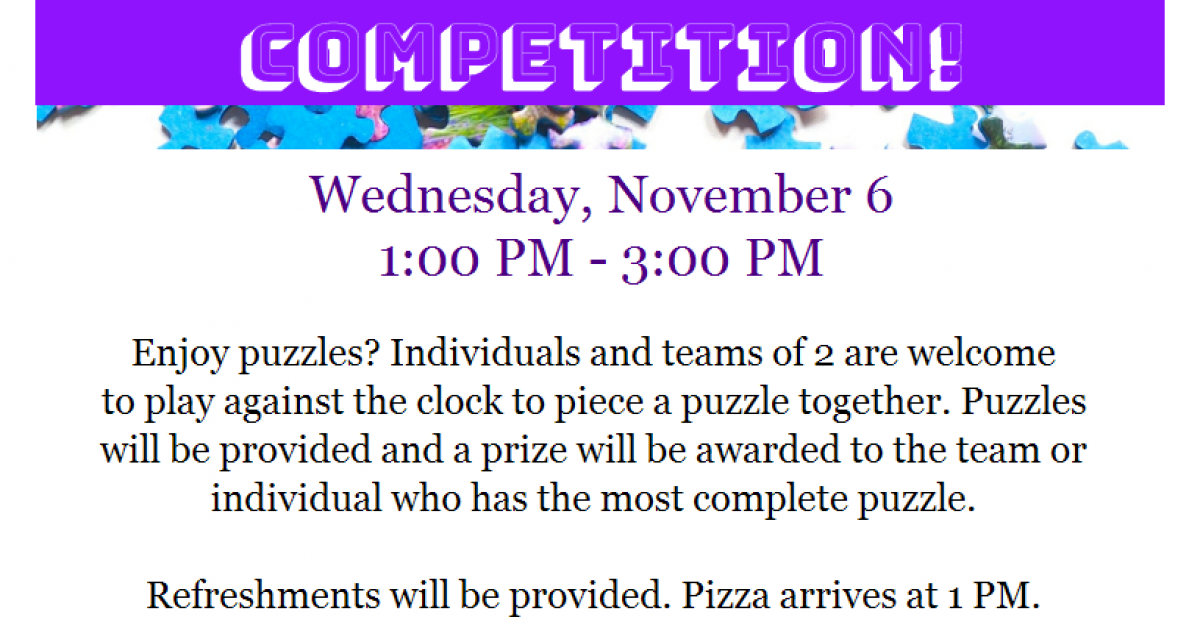 Enjoy puzzles? Individuals and teams of 2 are welcome to play against the clock to piece a puzzle together. Puzzles will be provided and a prize will be awarded to the team or individual who has the most complete puzzle.