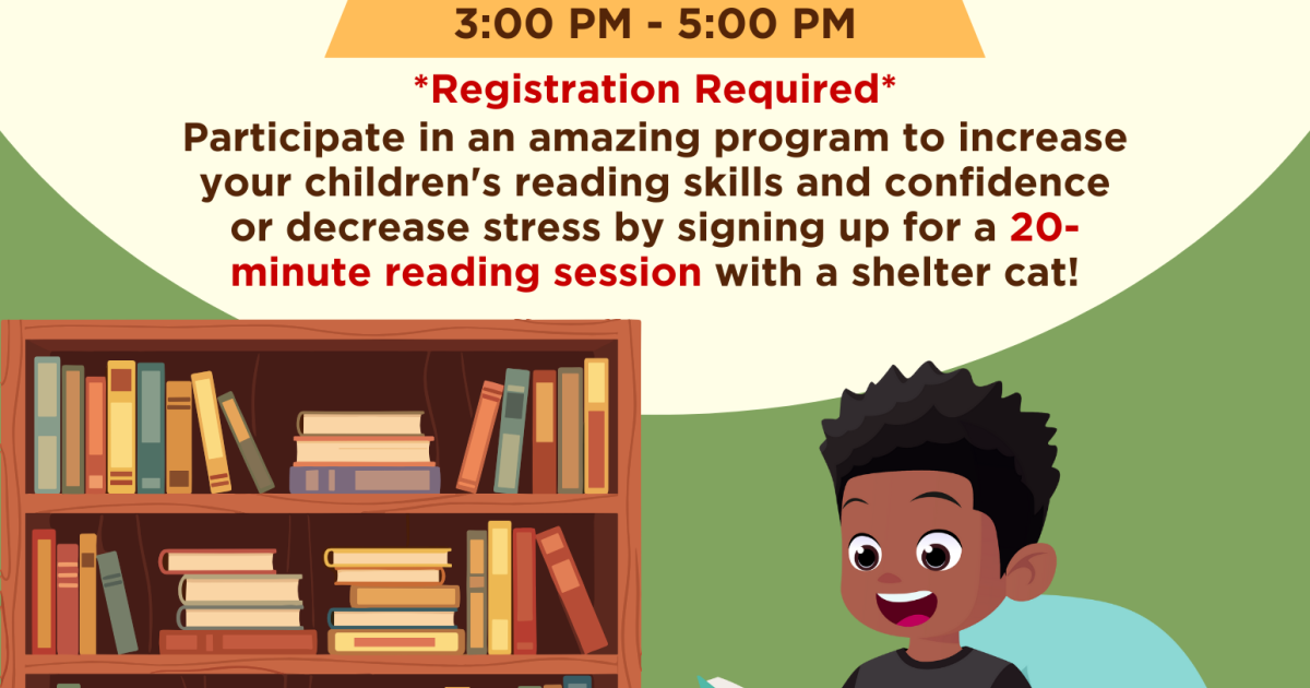 Event Details: Boost your child’s reading skills and confidence—or simply help them unwind—by signing up for a cozy 20-minute reading session with a shelter cat! We offer six sessions each day, so advanced registration is required. Spots fill quickly, but cancellations do happen, so be sure to join the list—you might just get lucky!