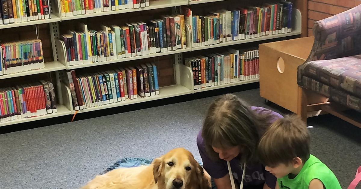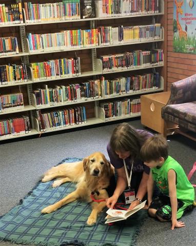 Duke is a licensed therapy dog who comes once a month.  Struggling or reluctant readers can come and spend time reading to Duke.