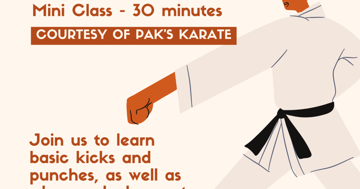 Come participate and learn in a 30-minute session with an instructor from Pak's Karate who teaches basic self-defense moves on Thursday, July 11th at 3 p.m. inside the East 80 Meeting Room