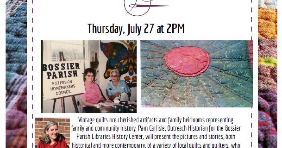 Pam Carlisle, will be talking about quilting clubs and other ladies' clubs, including the 'Shady Ladies' Homemaking Club that met for several years here at the Aulds library.
