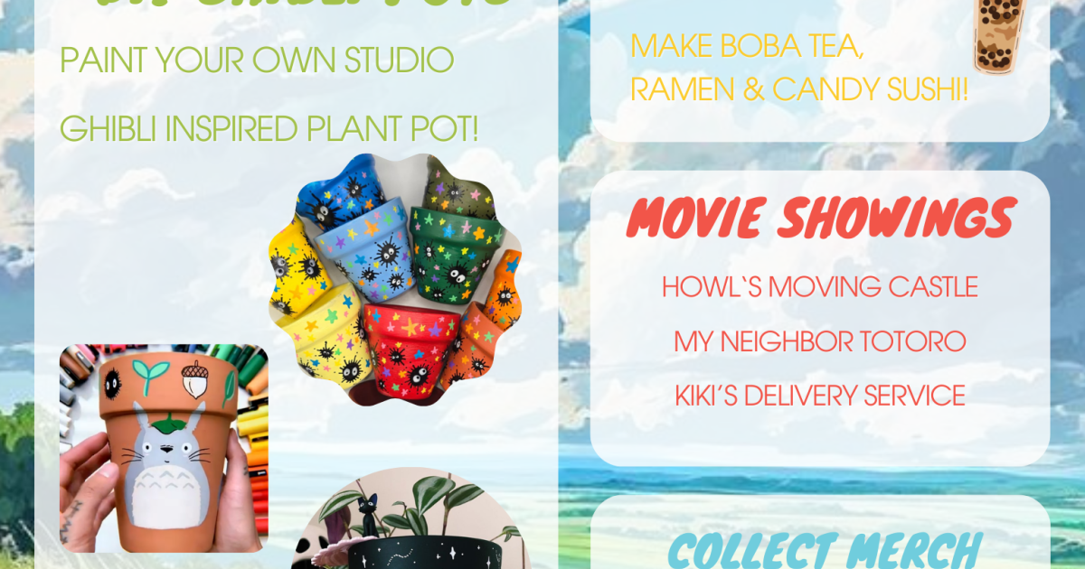 Paint your own Studio Ghibli inspired plant pot, make candy sushi, take home boba tea and ramen kits, enjoy popular Studio Ghibli films, and collect themed merch like bookmarks, stickers, tote bags and more!