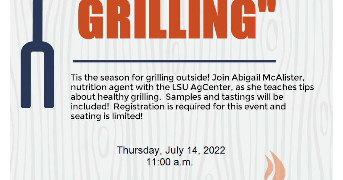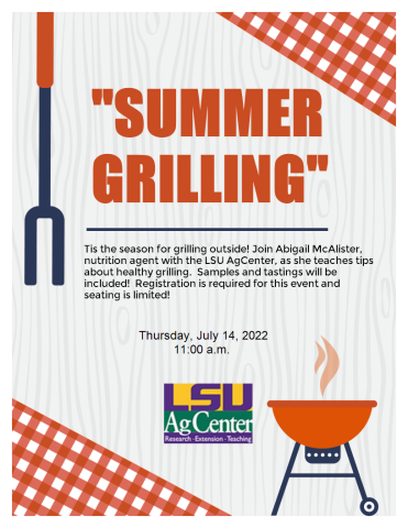 Tis the season for grilling outside! Join Abigail McAlister, nutrition agent with the LSU AgCenter, as she teaches tips about healthy grilling. Samples and tastings will be included! Registration is required for this event and seating is limited!