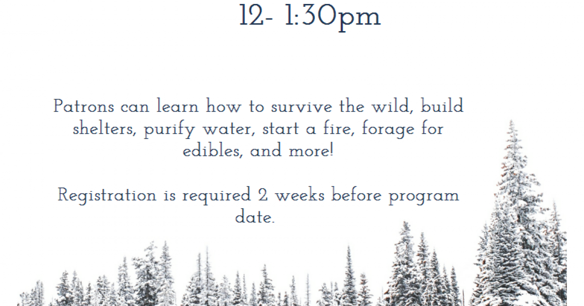 Patrons can learn how to survive the wild, build a shelter, purify water, start a fire, forage edibles, and more. Registration is required 2 weeks before program date.