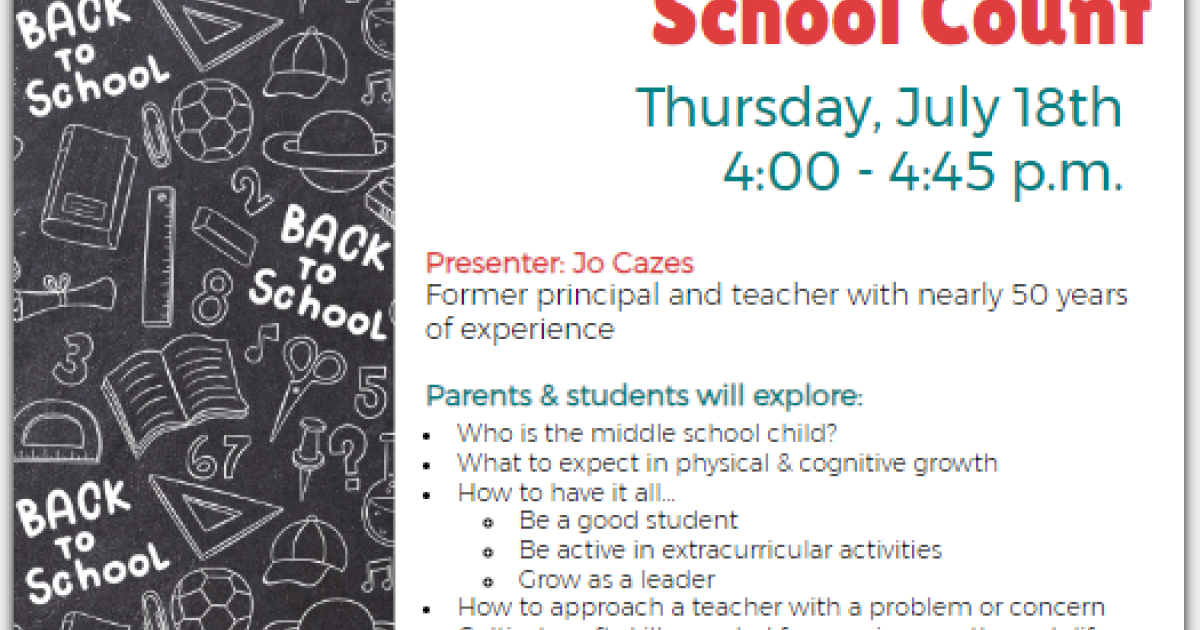 Jo Cazes, a former principal and teacher with nearly 50 years of experience, will provide tips and tools to help students and parents navigate the transition to middle school and beyond. Grade 5 students are also welcome.
