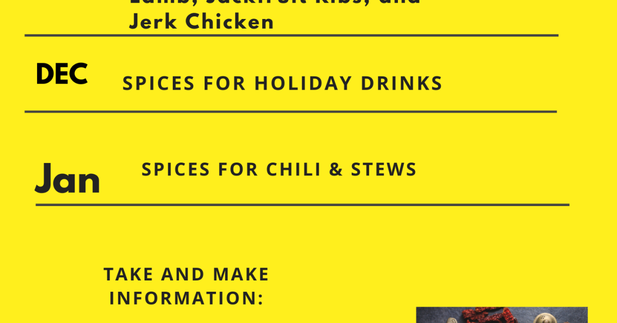 The holidays are approaching and we have recipes for mocktails ( a mixed non-alcoholic drink) and 1-2 spices will be provided for the new Take and Make kit- Spices to Amp up Your Dishes- that will detail the origin of these spices, tips, and more!