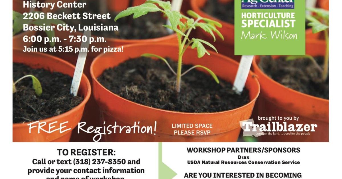 A free Spring Gardening Workshop on soil will be offered February 14 at the Bossier Parish Libraries History Center in Bossier City, featuring Horticulture specialist Mark Wilson from the LSU AgCenter.