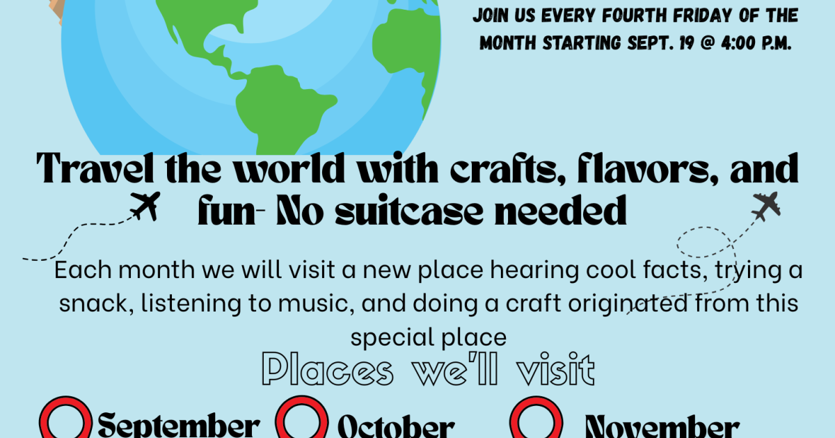 Join us for a monthly adventure! We invite you to Travel the World with us. We'll explore a new destination each month, discovering fascinating facts, tasting a local snack, enjoying music, and creating a craft inspired by each unique location. No suitcase required!