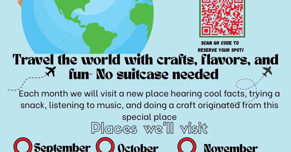 Join us for a monthly adventure! We invite you to Travel the World with us. We'll explore a new destination each month, discovering fascinating facts, tasting a local snack, enjoying music, and creating a craft inspired by each unique location. No suitcase required!