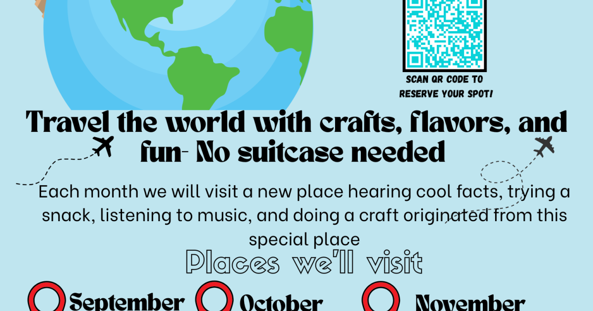 Join us for a monthly adventure! We invite you to Travel the World with us. We'll explore a new destination each month, discovering fascinating facts, tasting a local snack, enjoying music, and creating a craft inspired by each unique location. No suitcase required!