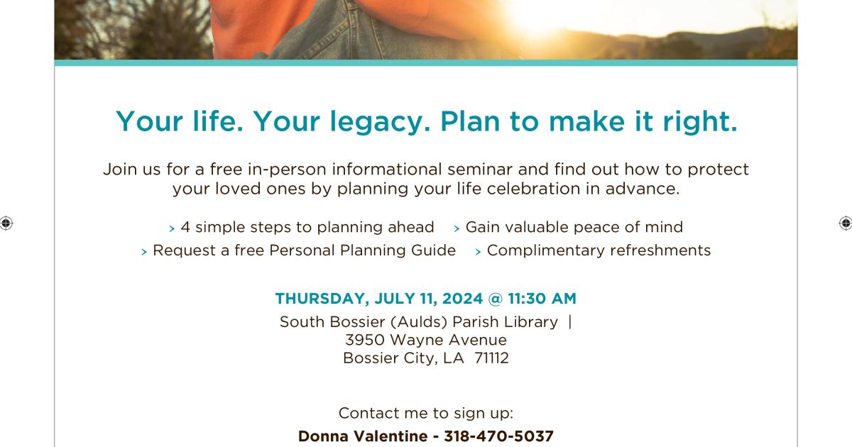 Most of us plan for important life events, such as weddings, our children's education, and retirement. But few of us prepare for the inevitable. This fast-moving program addresses the importance of making your final arrangements in advance and the steps to take.