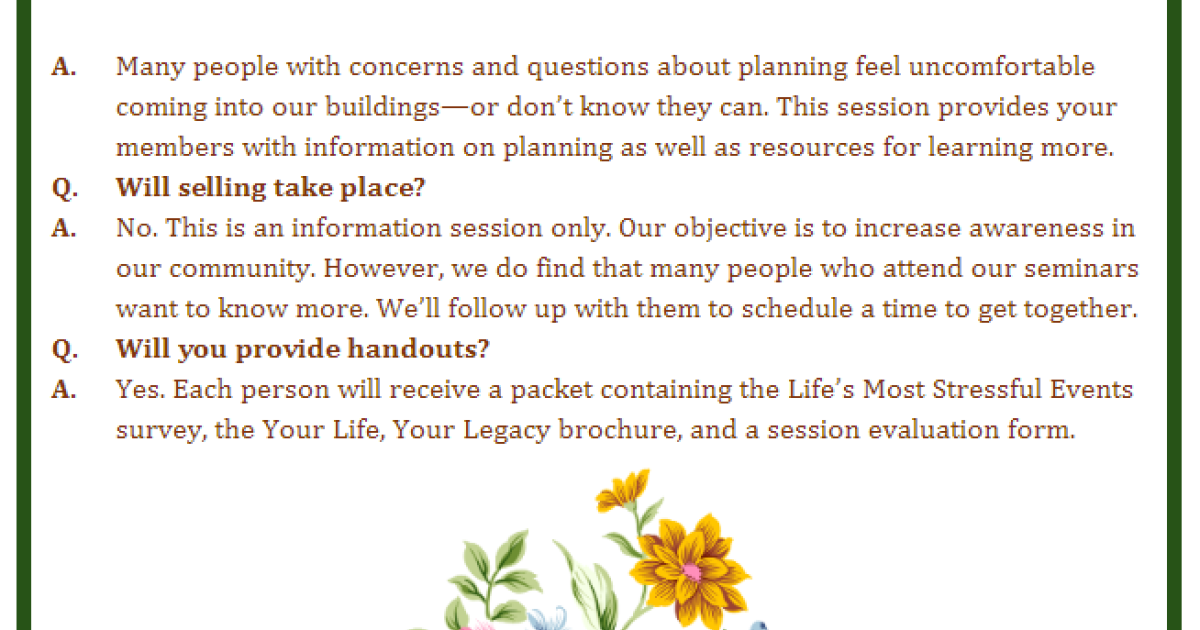 Join us for a free in-person informational seminar, and find out how to protect your loved ones by planning your life celebration in advance. A light lunch/refreshments will be served at 11:30 a.m., followed by an informational presentation and ample time for questions. Click on the image for a closer look at answers to some frequently asked questions.